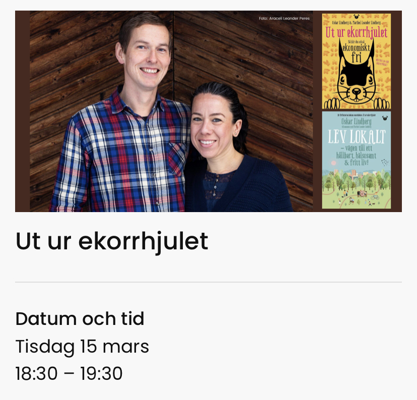 Du vet väl att våra böcker ”Ut ur ekorrhjulet” och ”Lev lokalt” båda finns som ljudböcker hos  Bookbeat,  Nextory (som båda erbjuder en gratis 30 dagars provperiod för nya kunder) och Storytel (som erbjuder 14 dagars gratis för nya kunder).