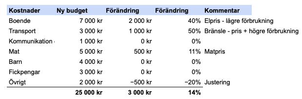 Allt ihop kan egentligen sammanfattas med energi och justerigen av budgeten består nästan helt av högre elpris och högre bränslepris. När det gäller energin vi förbrukar i hemmet har vi fått ner förbrukningen en del som motverkar medan vi tvingas erkänna att vårt nuvarande liv innebär att vi kör lite mer bil på ett år än för några år sedan samt att vi har köpt en större bil så att vi även ska kunna ta med barnens vänner framförallt när vi åker skidor. Samtidigt känner vi att möjligheten till mer samåkning är positiv även om den kanske slår negativt i vår budget.