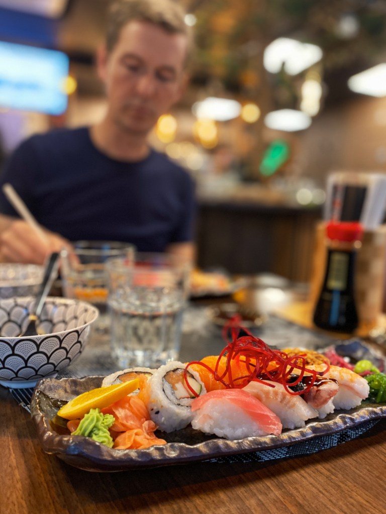 Innan vår föreläsning så passade vi på att äta sushi till middag, riktigt gott! Sushi Ro precis bredvid biblioteket där vi föreläste. Vi övernattade på hotell, det såg inte så speciellt ut på utsidan men jag gillade verkligen inredningen, särskilt påfågelstapeten!