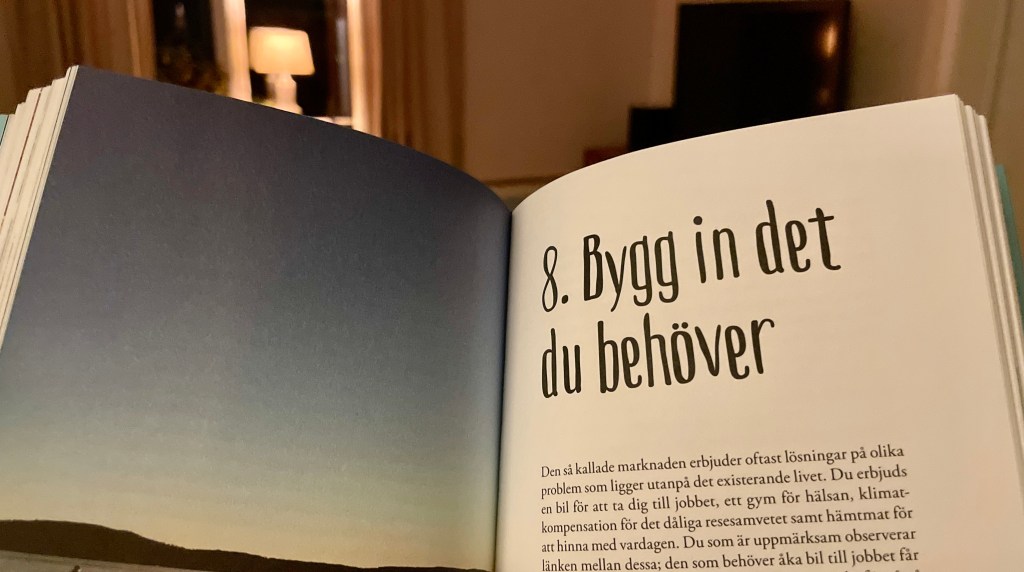 Ett annat perspektiv på ungefär samma sak skriver vi om i Lev lokalt där handlar det istället om marknadens tendens att erbjuda olika produkter och tjänster att lägga till utanpå livet som ska lösa olika upplevda problem, ett SPA för att slappna av, ett gymkort för att bli hälsosam och snabbmat för att hinna med allting. Om man istället som jag beskriver ovan kan gå till det mesta, kanske till och med välja en naturskön väg och hinna mem i tid för att laga riktig mat så sparar man både pengar och tid samtidigt som livskvaliteten ökar. Win-win-win!