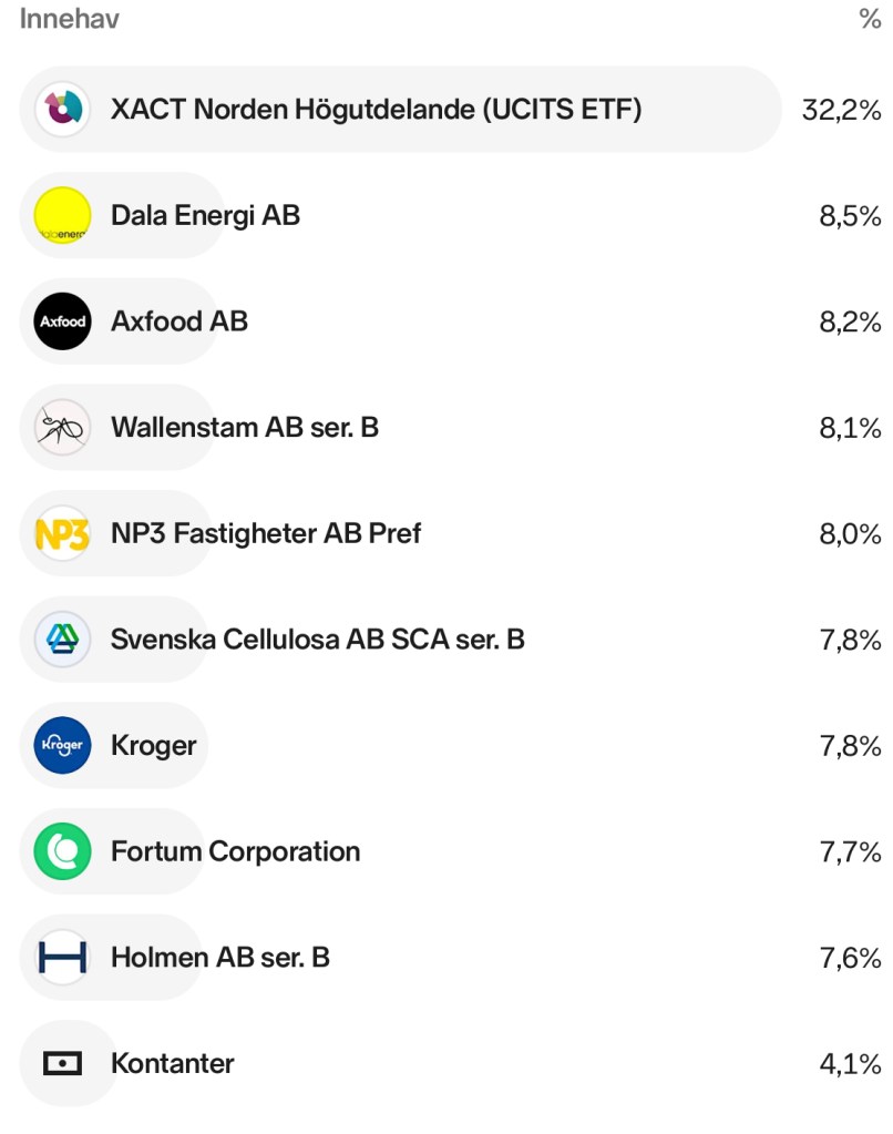 Basen är en börshandlad fond (XACT Norden högutdelande) med inriktning mot utdelande bolag i norden och som ger direktavkastning. Sen har vi valt lite extra exponering mot några branscher som vi tror är stabila i alla lägen nämligen energi, (bostads-)fastigheter, skog och livsmedel. Utöver det som finns i portföljen så har vi kontanter och ränteplaceringar som motsvarar ungefär ett års utgifter. Tanken med den här portföljen är inte att försöka slå något index eller nå maximal avkastning men vi har en förhoppning om relativt låg volatilitet något som fungerat rätt bra genom de senaste årens olika turbulenta tider.