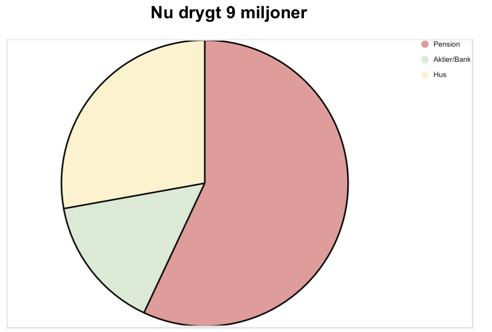 Den första bilden som jag vill visa för sammanhang är fördelningen av vårt kapital just nu, mellan vårt hus, extra pension och våra aktier/bank som vi lever på kortsiktigt.